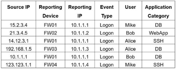 Grouping by Reporting Device, Reporting IP, and Application Category yields five unique tuples: (FW01, 10.1.1.1, DB), (FW02, 10.1.1.2, WebApp), (FW01, 10.1.1.1, SSH), (FW03, 10.1.1.3, DB), and (FW04, 10.1.1.4, SSH).