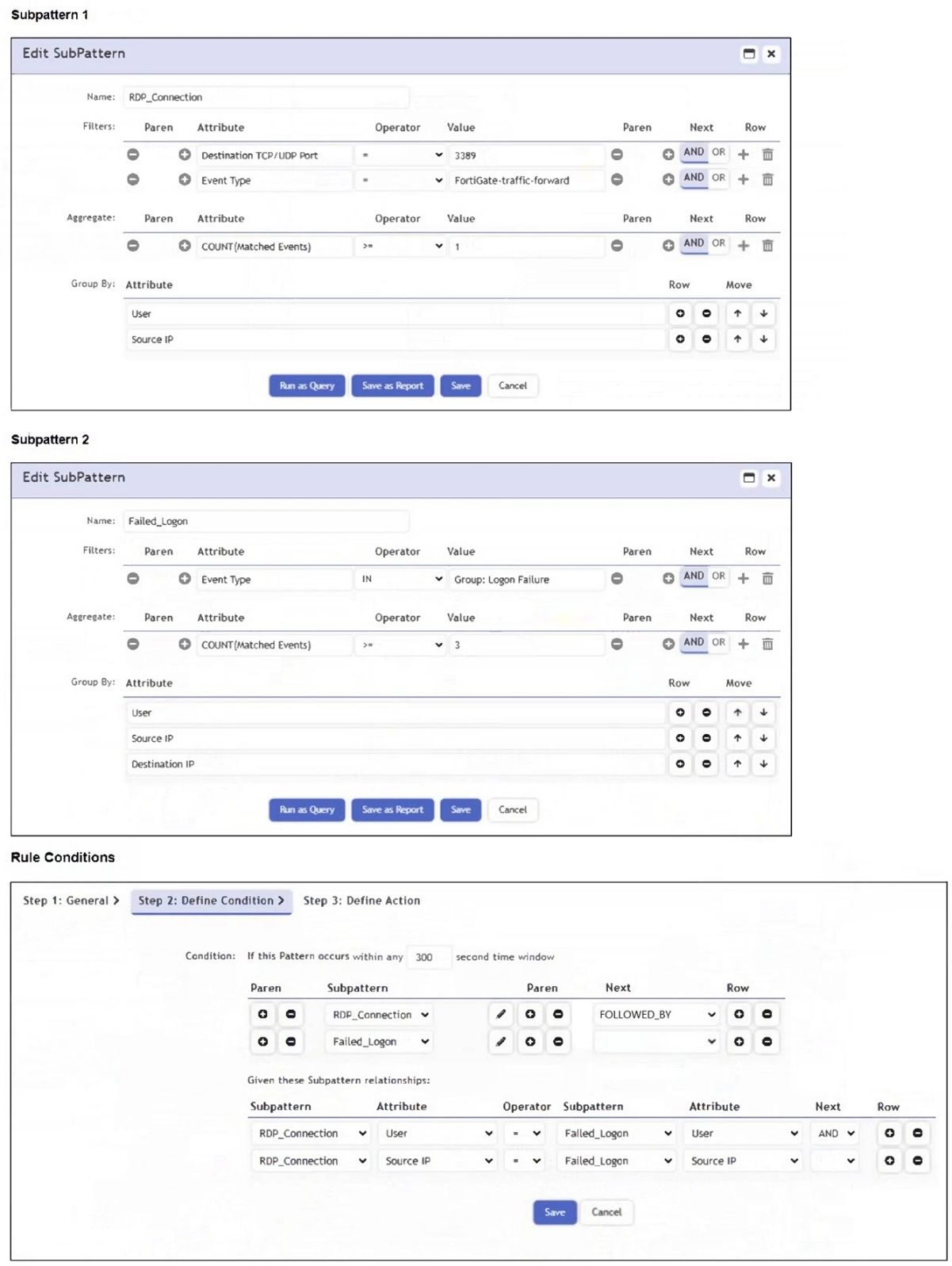 The user initiates an RDP session (Subpattern 1) and then fails to log in multiple times (Subpattern 2 with COUNT(Matched Events) >= 3) - both from the same Source IP and User within 300 seconds.