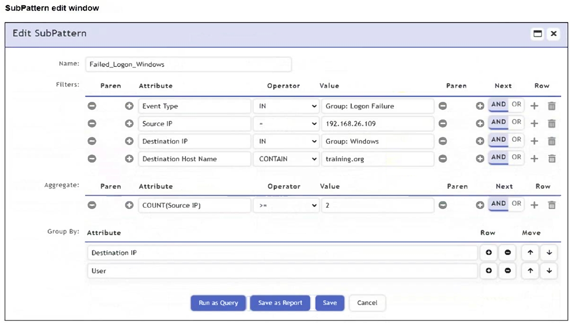 The Group By attributes - Destination IP and User - cause the aggregation (COUNT(Source IP) >= 2) to apply within each unique combination of those groupings. This restricts the count calculation and can prevent the rule from triggering incidents, even if matching events exist in the Analytics tab.