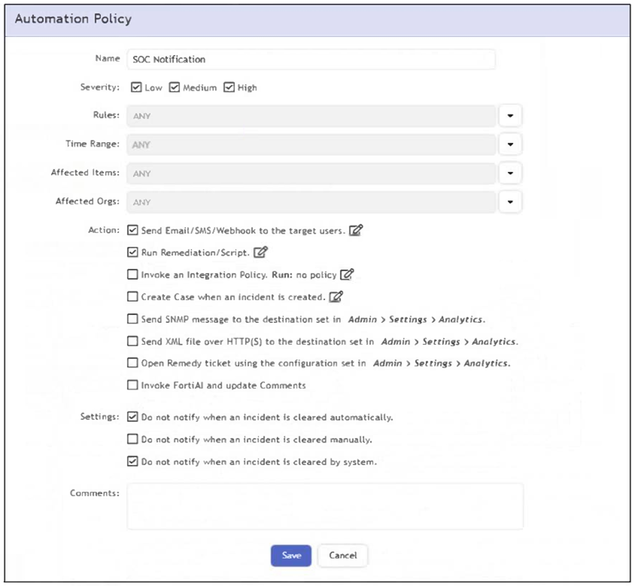 If a rule containing the automation policy shown in the exhibit triggers, what will happen?