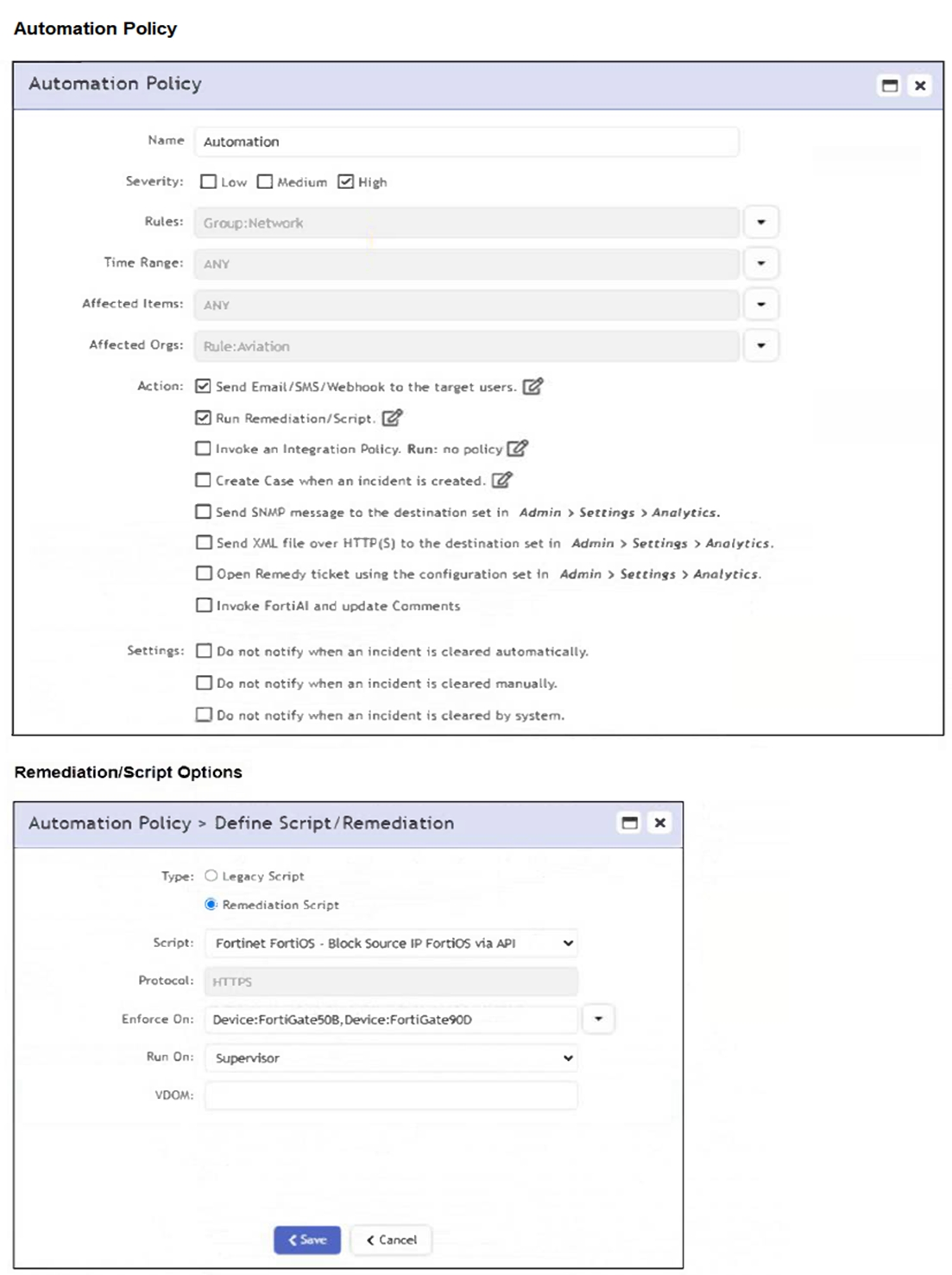 The automation policy is configured to run a remediation script named 'Fortinet FortiOS - Block Source IP FortiOS via API'. It specifies enforcement on two FortiGate devices: FortiGate508 and FortiGate90D. Therefore, associated source IP addresses will be blocked on those two FortiGate firewalls only.