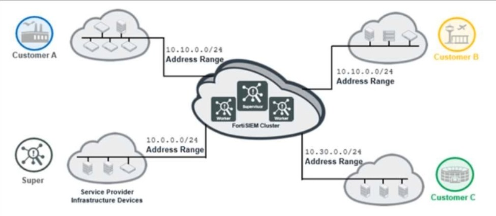 The service provider deployed FortiSIEM without a collector and added three customers on the supervisor.