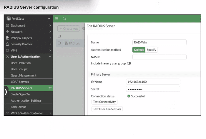 On FortiGate, a RADIUS server is configured to forward authentication requests to FortiAuthenticator, which acts as a RADIUS proxy. FortiAuthenticator then relays these authentication requests to a remote Windows AD server using LDAP.