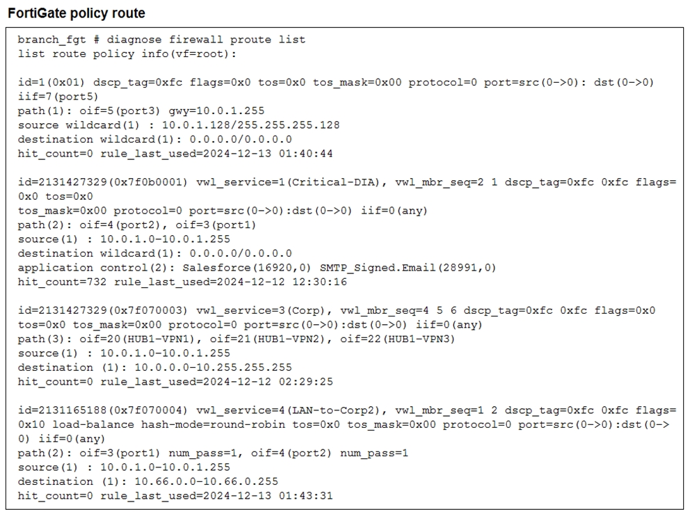 The policy-route output shows the matching SD-WAN service for destination 10.66.0.0/24 is vwl_service=4 (LAN-to-Corp2) with vwl_mbr_seq=1 2 and paths oif=3(port1) and oif=4(port2). Therefore, traffic from 10.0.1.133 to 10.66.0.125 is steered via SD-WAN member ID 1 or 2.