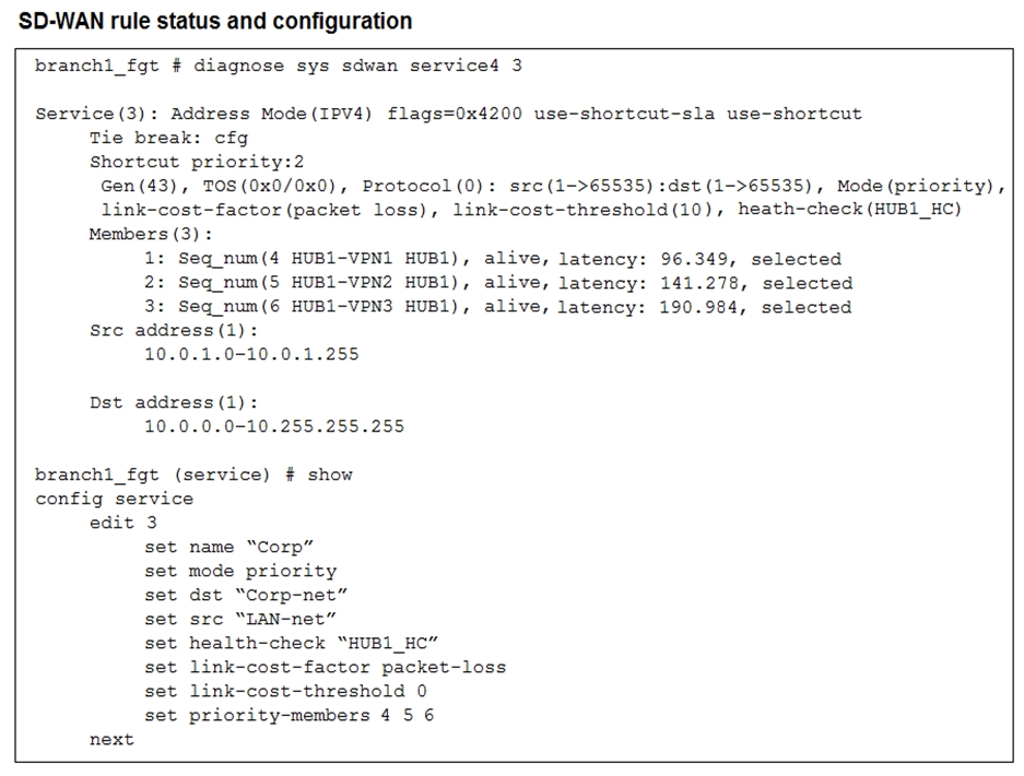 The rule is in priority mode with HUB1-VPN1 (seq 4) as the first preferred member, HUB1-VPN2 second, and HUB1-VPN3 third. Latency itself does not cause HUB1-VPN3 to become preferred unless a higher-priority member fails SLA. If HUB1-VPN1's latency exceeds the SLA threshold (here simulated by latency reaching 200 ms), FortiGate stops using it and moves down the priority list. That is when HUB1-VPN3 could become the active path.