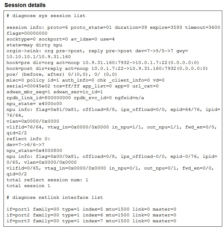 The exhibit shows the details of a session and the index numbers of some relevant interfaces on a FortiGate device that supports hardware offloading.