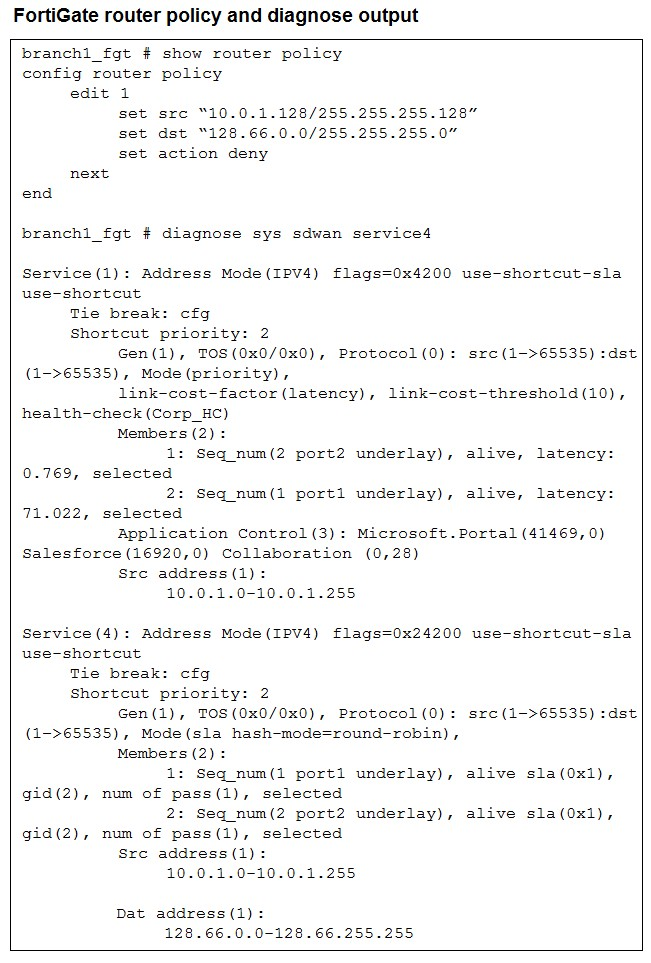 The router policy explicitly denies traffic with source 10.0.1.128/25 (which includes 10.0.1.130) and destination 128.66.0.0/24 (which includes 128.66.0.125). Even though SD-WAN service 4 shows members (port1 and port2) alive and available for this traffic, the router policy is evaluated first and blocks it. Therefore, FortiGate drops the traffic flow.