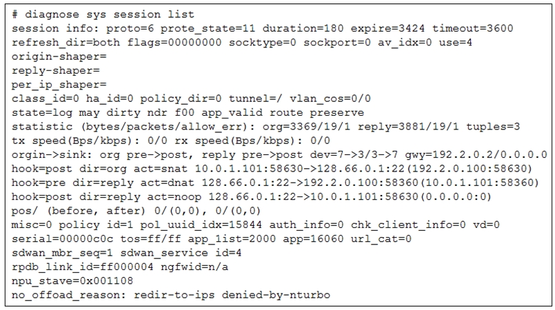 The line no_offload_reason: redir-to-ips denied-by-nturbo shows that the session is not offloaded to the NPU (Network Processing Unit) and is being processed by the main CPU. A session that is not offloaded can be re-evaluated. If the outgoing interface (the one currently being used) goes down, the FortiGate will re-evaluate the session against the SD-WAN rules to find a new active member to steer the traffic through. This is a fundamental behavior of SD-WAN, which ensures network resilience.