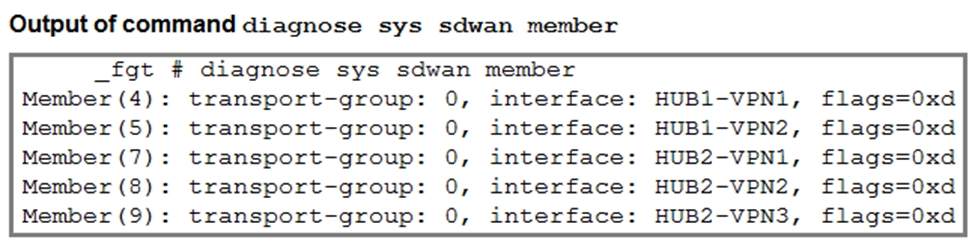 The diagnose output lists SD-WAN members 4(HUB1-VPN1), 5(HUB1-VPN2), 7(HUB2-VPN1), 8(HUB2-VPN2), and 9(HUB2-VPN3). It does not include member 6 (HUB1-VPN3). From the template, HUB1-VPN3 is installed only on branch2_fgt and branch3_fgt - not on branch1_fgt. Therefore, the output must be from branch1_fgt.