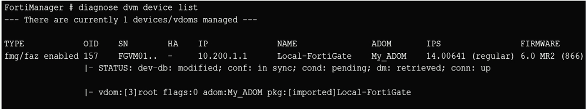 STATUS: dev-db: modified; conf: in sync; cond: pending; dm: retrieved; conn: up -- dev-db: modified -- This is the device setting status which indicates that configuration changes were made on FortiManager. -- conf: in sync -- This is the sync status which shows that the latest revision history is in sync with Fortigate's configuration. -- cond: pending -- This is the configuration status which says that configuration changes need to be installed.