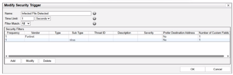 According to the FortiNAC-F Administrator Guide and relevant training materials for versions 7.2 and 7.4, the Filter Match setting is the critical logic gate for this process. As seen in the exhibit, the 'Filter Match' configuration is set to 'All'. This means that for the Security Trigger named 'Infected File Detected' to 'fire' and generate a Security Event or a subsequent Security Alarm, every single filter listed in the Security Filters table must be satisfied simultaneously by the incoming data.