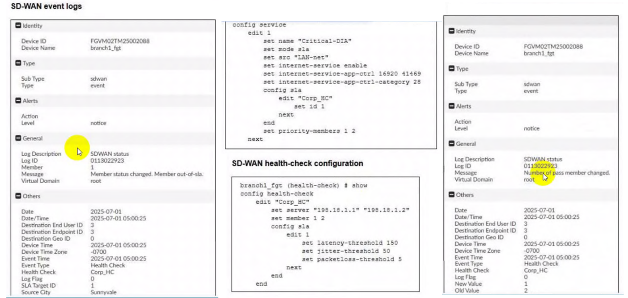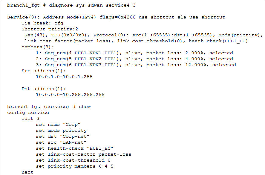 Tie-Breaker Logic: When multiple links have the same packet loss, the FortiGate uses the Member Priority Order defined in the rule (set priority-members 6 4 5) as the tie-breaker.