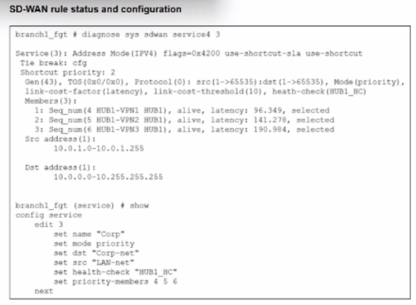 Rule Logic (Best Quality): In the exhibit, the SD-WAN rule is configured with set mode priority, which corresponds to the Best Quality strategy. This strategy ranks members based on the link-cost-factor, which is set to latency.