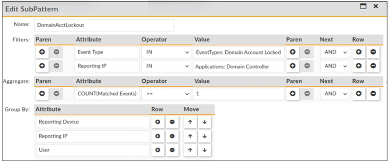 The rule filters events with an event type that belong to the Domain Account Locked CMDB group and a reporting IP that belong to the Domain Controller applications group. This means that only events that have both criteria met will be processed by this rule. The event type and reporting IP are joined by an AND operator, which requires both conditions to be true.