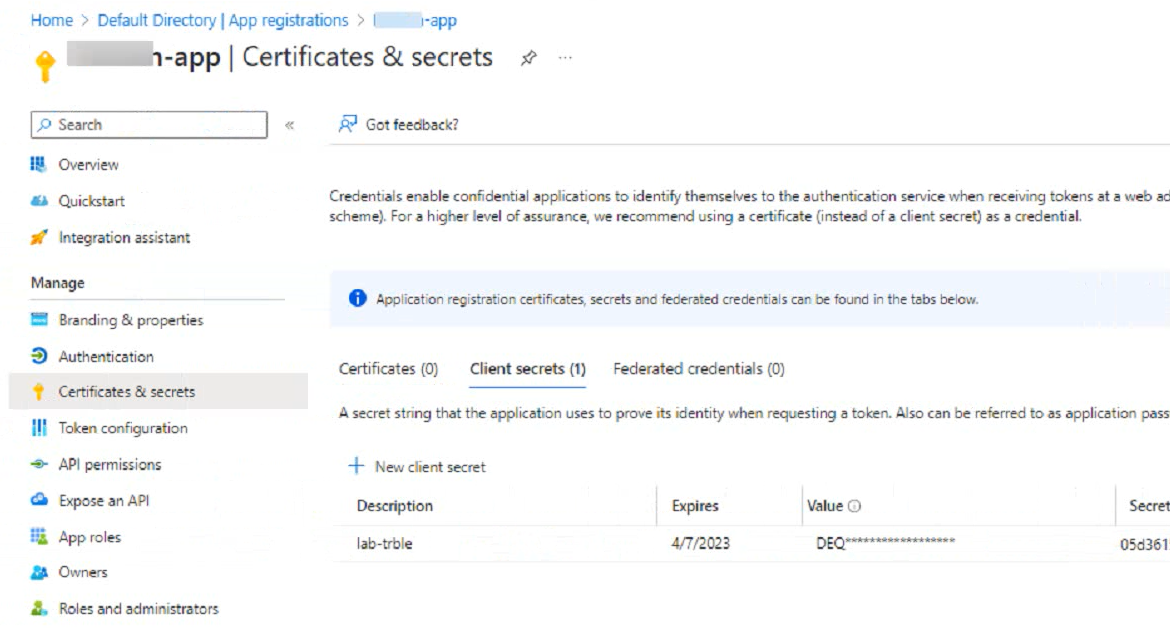 Select Certificates & Secrets > New client secret to create a new client secret.