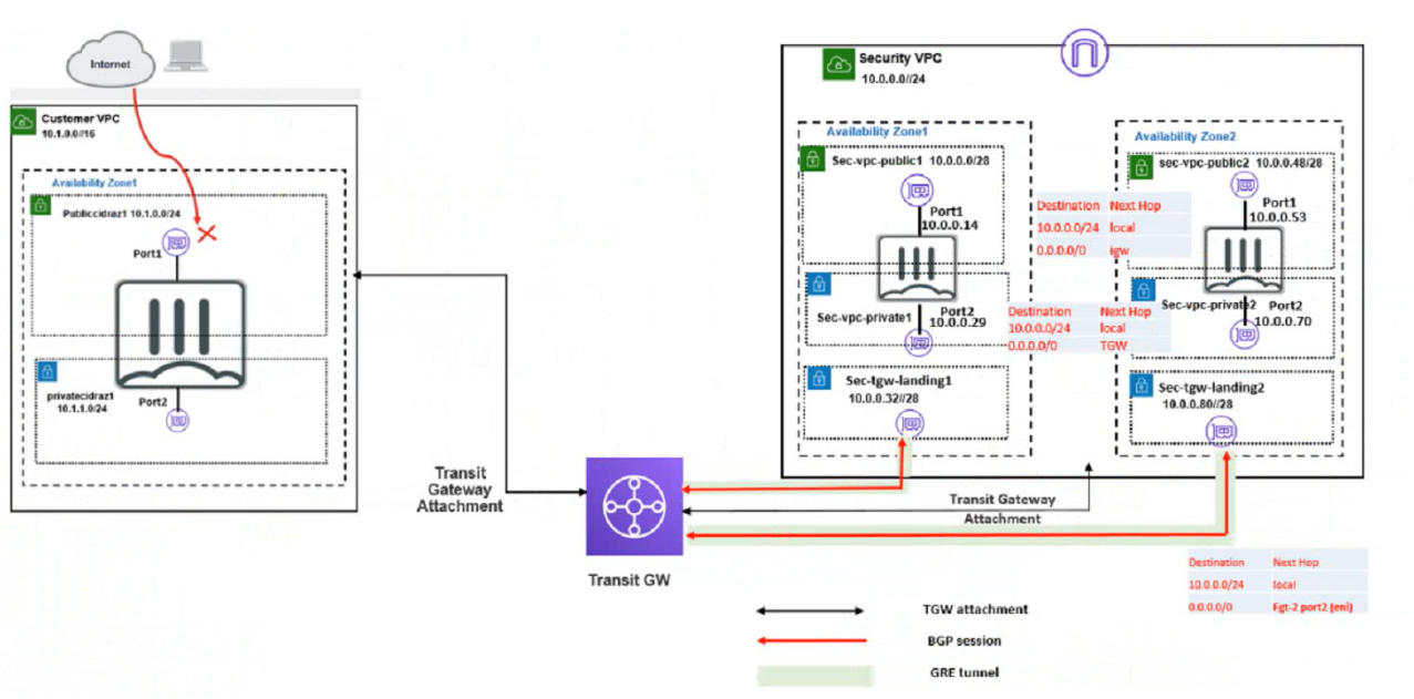 Also, you must ensure that the Customer VPC FortiGate VM sends all the outbound Internet traffic through the Security VPC How do you correct this Issue with minimal configuration changes?