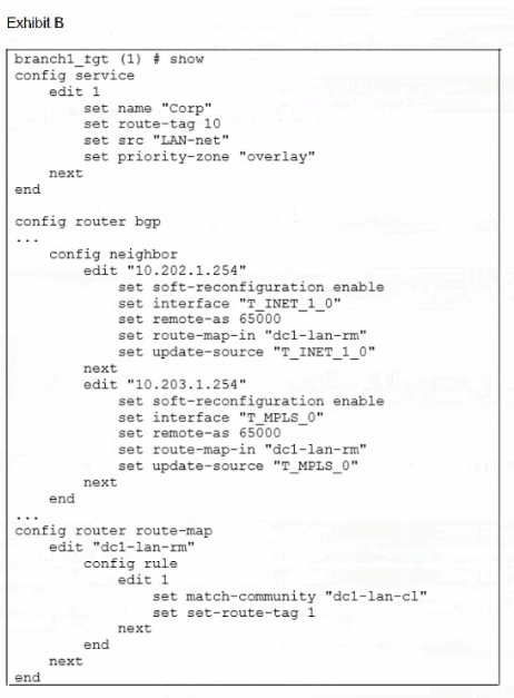 Exhibit B shows the SD-WAN rule configuration, the BGP neighbor configuration, and the route map configuration.