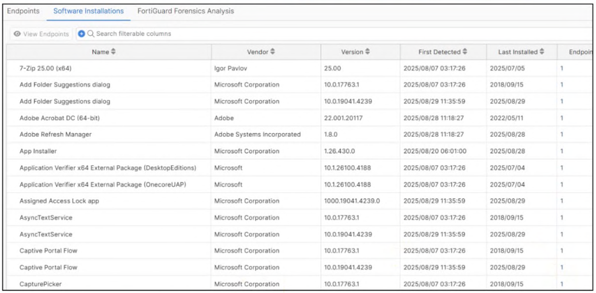 Actions Available: While the primary view is informational, the presence of the View Endpoints button (visible in the top-left) allows administrators to pivot from a specific application to a list of all individual devices where that software is present, facilitating targeted remediation.