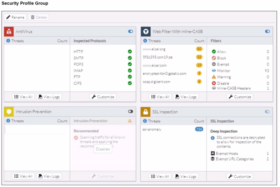 Conclusion: Because the traffic is only undergoing certificate-level inspection, the antivirus engine cannot analyze the encrypted eicar.com-zip file payload, allowing the download to proceed even though an antivirus profile is active in the group.