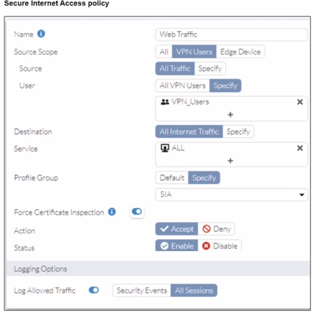 Exhibit Analysis: The Secure Internet Access policy exhibit clearly shows the toggle for Force Certificate Inspection is enabled (set to 'ON'). As specified in the Fortinet technical documentation, enabling this option forces the policy to use Certificate Inspection only, overriding any Deep Inspection settings that might be defined in the Profile Group.