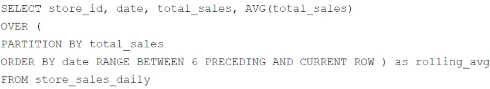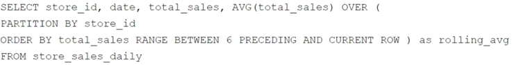 Your company has several retail locations. Your company tracks the total number of sales made at each location each day. You want to use SQL to calculate the weekly moving average of sales by location to identify trends for each store. Which query should you use?