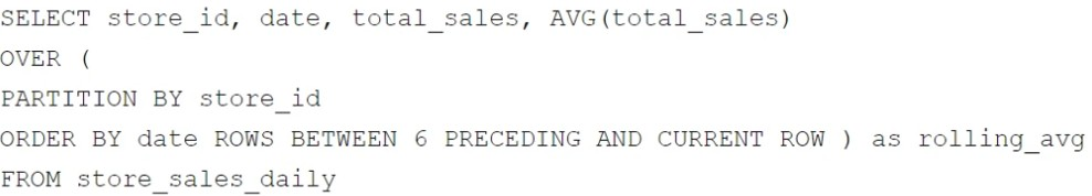 The AVG(total_sales) computes the average sales over the defined rolling window.
