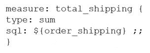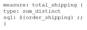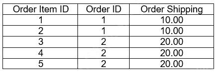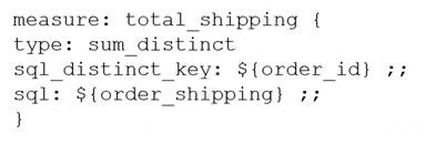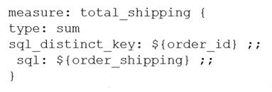 A LookML Developer is working with denormalized tables and needs to create a measure adding up the Order Shipping column in the table below: