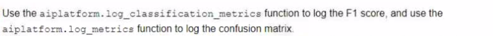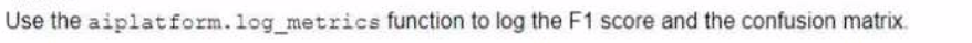 You want to migrate a scikrt-learn classifier model to TensorFlow. You plan to train the TensorFlow classifier model using the same training set that was used to train the scikit-learn model and then compare the performances using a common test set. You want to use the Vertex Al Python SDK to manually log the evaluation metrics of each model and compare them based on their F1 scores and confusion matrices. How should you log the metrics?