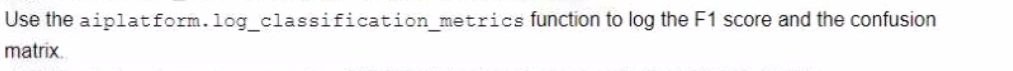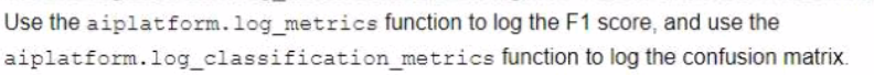 To log the metrics of a machine learning model in TensorFlow using the Vertex AI Python SDK, you should utilize theaiplatform.log_metricsfunction to log the F1 score andaiplatform.log_classification_metricsfunction to log the confusion matrix. These functions allow users to manually record and store evaluation metrics for each model, facilitating an efficient comparison based on specific performance indicators like F1 scores and confusion matrices.Reference: The answer can be verified from official Google Cloud documentation and resources related to Vertex AI and TensorFlow.