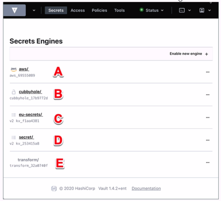 In the HashiCorp Vault UI, secrets are organized in a tree-like structure. To view a secret located at secret/my-secret, you would click on the ''secret/'' folder in the tree, then click on the ''my-secret'' file. In this screenshot, the ''secret/'' folder is located at option C. This folder contains the secrets that are stored in the key/value secrets engine, which is the default secrets engine in Vault. The key/value secrets engine allows you to store arbitrary secrets as key/value pairs. The key is the path of the secret, and the value is the data of the secret. For example, the secret located at secret/my-secret has a key of ''my-secret'' and a value of whatever data you stored there.