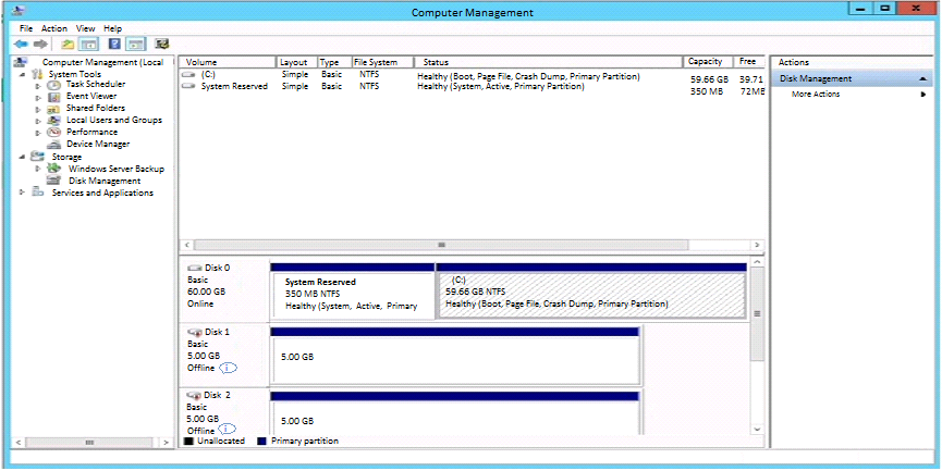 The administrator has presented an HPE 3PAR StoreServer virtual volume to a server. A single virtual volume is seen as two different offline disks on a Windows 2012 R2 server.