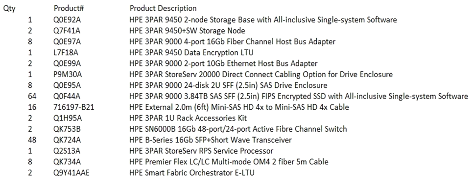 You propose HPE 3PAR 9450 arrays at each site. The displayed Bill of Materials (BOM) shows the hardware and software components for one site.