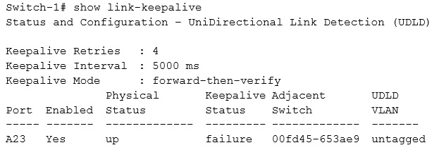Switch-1 and Switch-2 connect on interface A23. The switches experience a connectivity issue. The network administrator sees that both switches show this interface as up. The administrator sees the output shown in the exhibit on Switch-1.