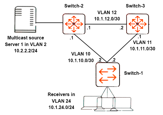 Network administrators set up PIM-DM to route multicast traffic from Server 1 to clients in VLAN 24. The multicasts are not active now, but the administrators want to determine which path the multicasts will take.