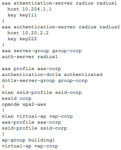 A point venture between two companies results in a fully functional WLAN Aruba solution. The network administrator uses the following script to integrate the WLAN solution with two radius servers, radius1 and radius2.