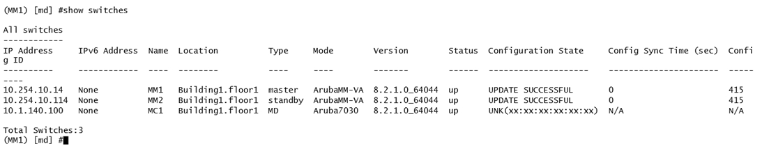 A network administrator adds a Mobility Controller (MC) in the /mm level and notices that the device does not show up in the managed networks hierarchy. The network administrator accesses the CLI. executes the show switches command, and obtains the output shown in the exhibit.