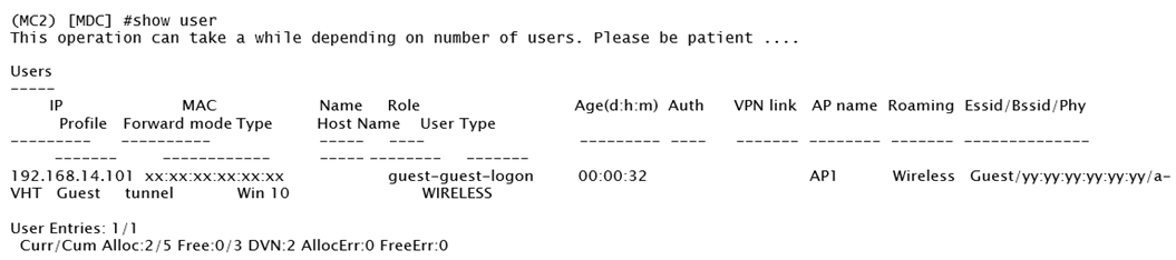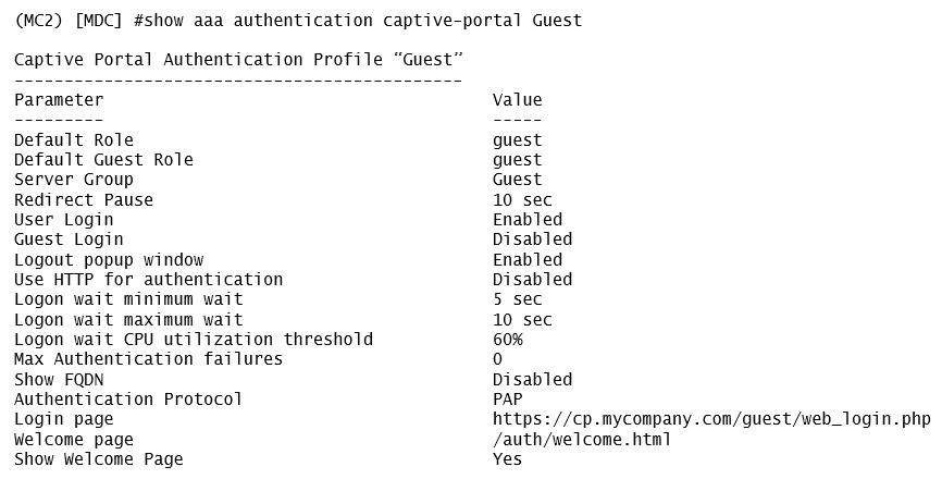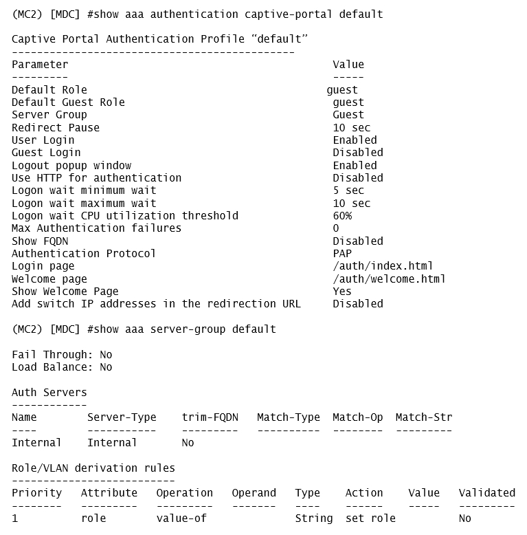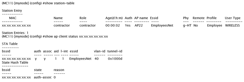 A captive portal-based solution is deployed in a Mobility Master (MM) - Mobility Controller (MC) network. A wireless station connects to the network and attempts the authentication process. The outputs are shown in the exhibits.