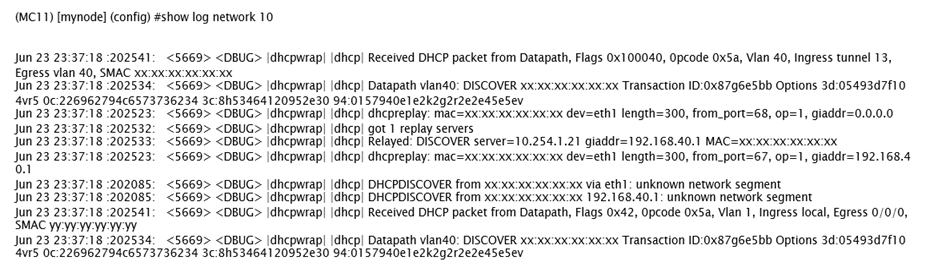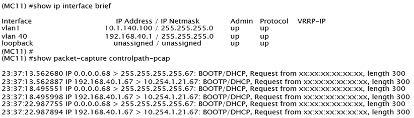 A network administrator wants to allow contractors to access the corporate WLAN named EmployeesNet with the contractor role in VLAN 40. When users connect, they do not seem to get an IP address. After some verification checks, the network administrator confirms the DHCP server (10.254.1.21) is reachable from the Mobility Controller (MC) and obtains the outputs shown in the exhibits.