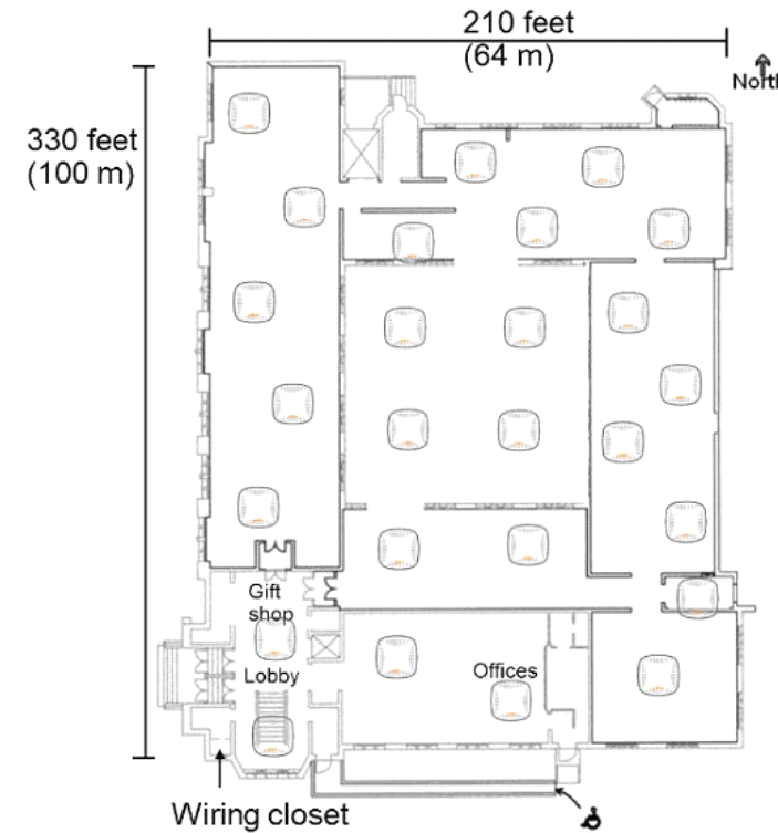 The exhibit also shows a preliminary plan tor AP locations, me museum has eight Ethernet drops in the lobby and girt stop, but has otherwise not been wired.