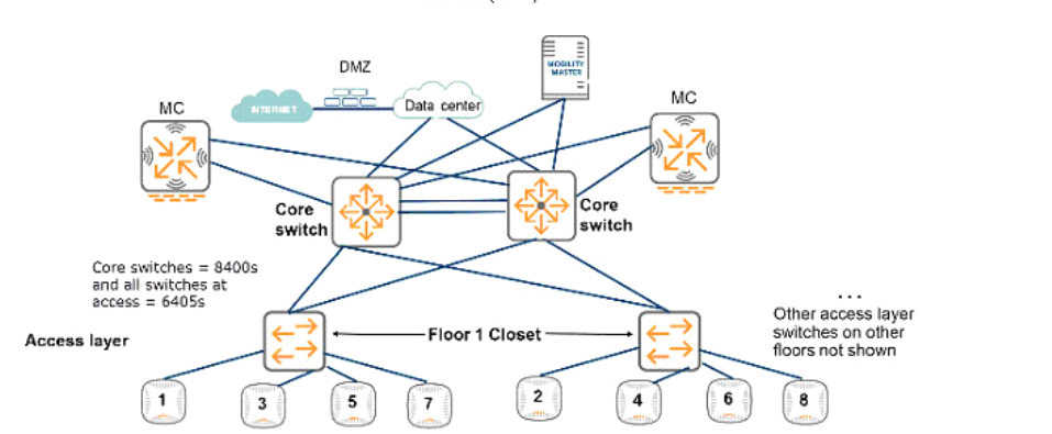 access layer connects to the network cone with a pair of Aruba CX 6300M aggregation switches.