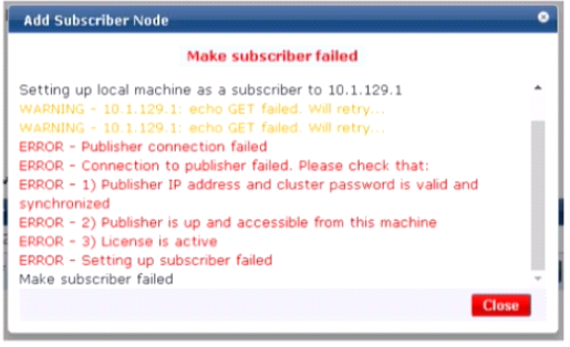 A customer is doing a new ClearPass installation and is setting up clustering between two ClearPass servers running a 6.8.6 version. The ClearPass server failed to add the subscriber node. The customer was able to login to the console of the ClearPass server with the same CLI password used during the cluster setup. The customer has sent you the screenshots seeking your support Why did an attempt to add a subscriber node failed showing that error?