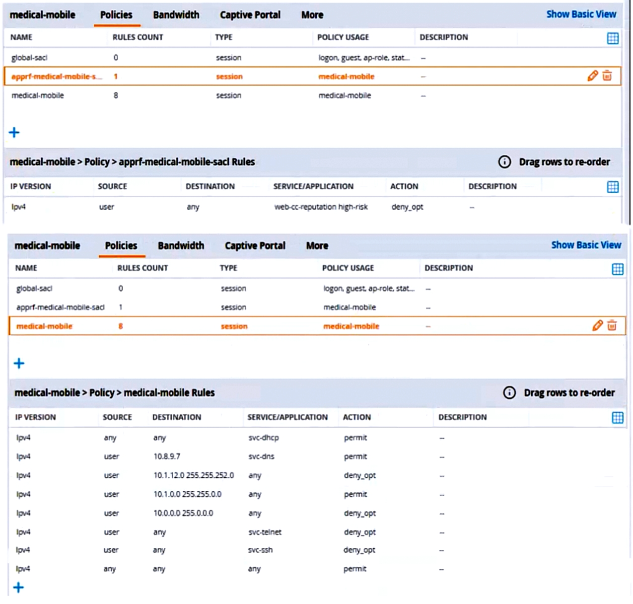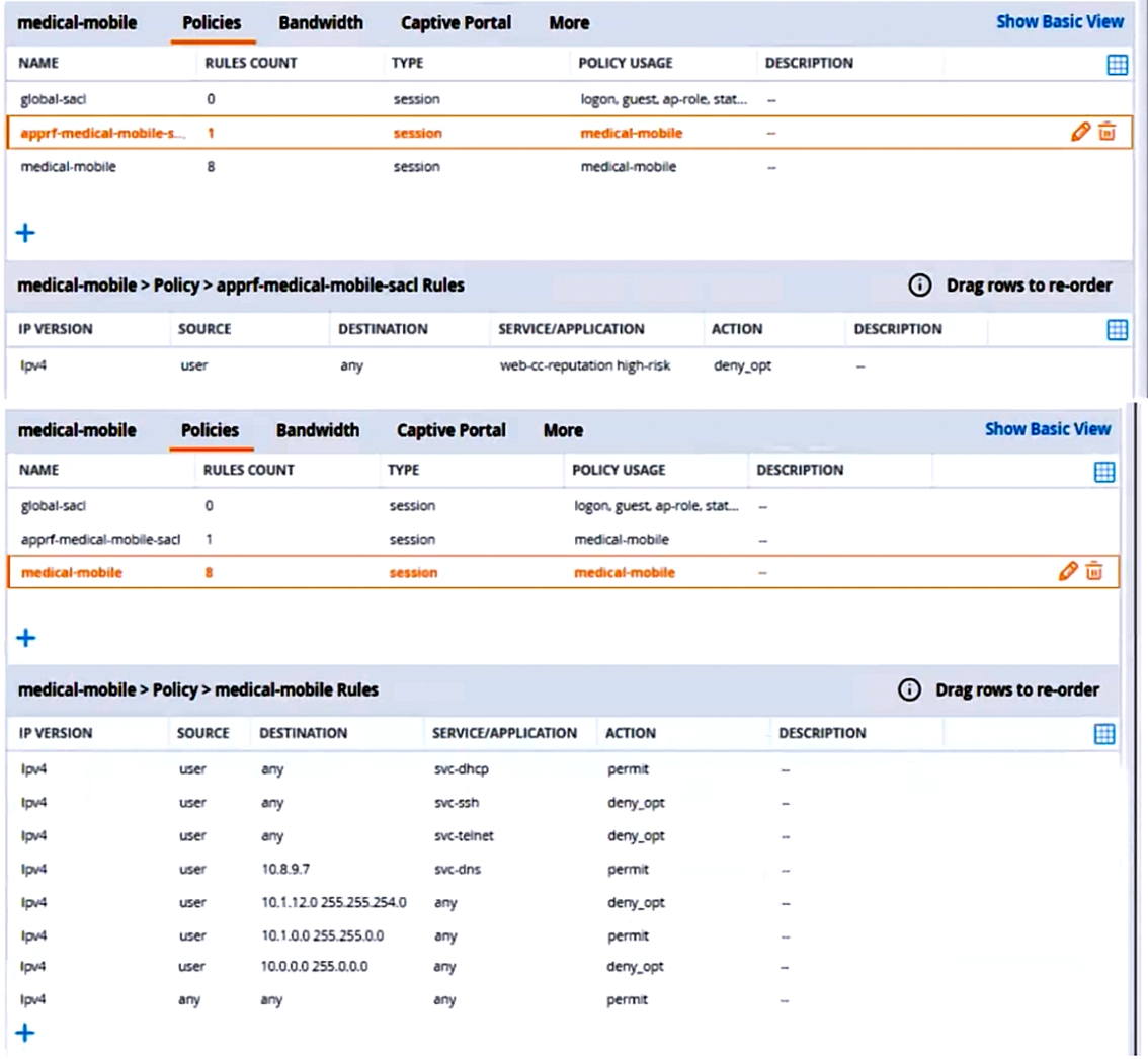There are multiple issues with this configuration. What is one change you must make to meet the scenario requirements? (In the options, rules in a policy are referenced from top to bottom. For example, ''medical-mobile'' rule 1 is ''ipv4 any any svc-dhcp permit,'' and rule 8 is ''ipv4 any any any permit''.)