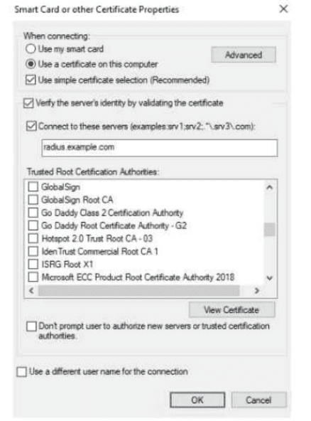Server Validation: Specify the exact RADIUS server names in the 'Connect to these servers' field.