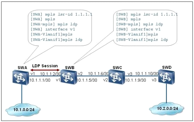 On the network shown in the following figure, a MPLS LSP is configured and a local LDP session is established between SWA and SWB. Which of the following statements is true?