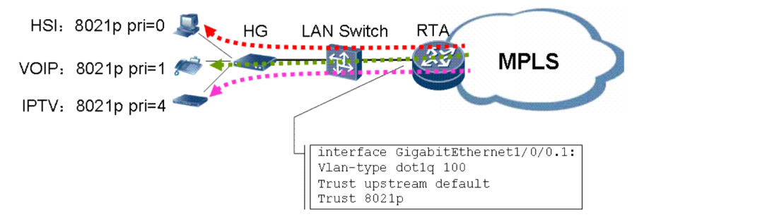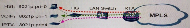 RTA is an edge router of the MPLS backbone network. It provides the access services for users under Layer 2 switches and different users by subinterface . User A access VLAN 12 and has subscribed to the His, VoIP, and IPTV services. According to 802 1p priorities, the value indicates the His service, 1 indicates the VoIp service, and 4 indicates the IPTV service. RTA is configured on he access side as follows.