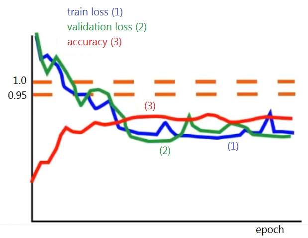 A neural network is trained for a classification task. During training, you monitor the loss function for the train dataset and the validation dataset, along with the accuracy for the validation dataset. The goal is to get an accuracy of 95%.
