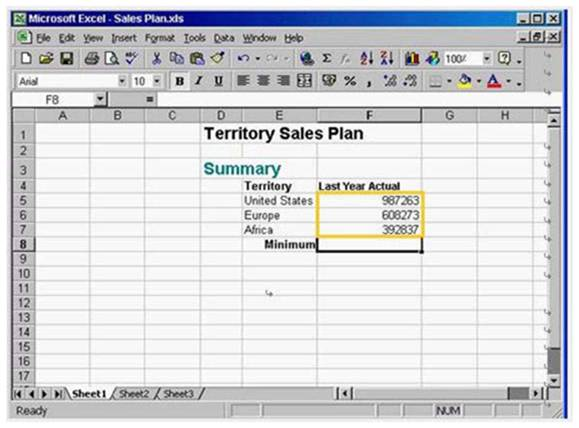 Type a function into cell F8 that will calculate the smallest value in the highlighted range. Press the Enter key when you have finished.