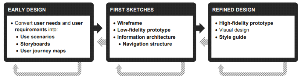 The purpose of 'Design: produce design solutions to meet user requirements' is to convert user needs and user requirements into a working interactive system - that is, a design solution. Deliverables from the analysis of the context of use, such as user groups, as-is scenarios and personas are also used. The conversion considers dialogue principles, heuristics, style guides and design concepts like affordance and mental models as described in section 6.1. Design patterns are existing design solutions that have been shown to work for users and can therefore be reused in the designs of new interactive systems.