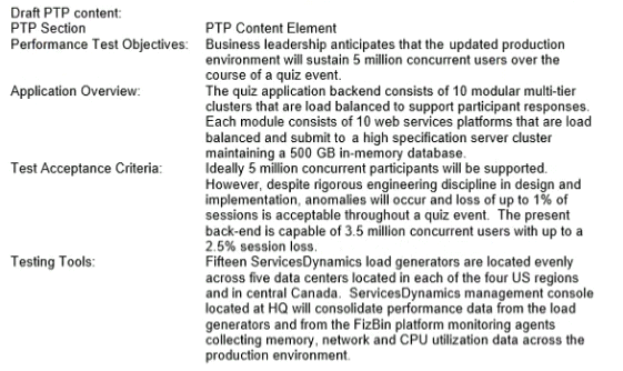 You have been asked to test the performance of a software and system update to a North American mobile trivia quiz game application. The quiz app is available on major app stores serving English-speaking users. The number of concurrent users planned for is 5 million. Winning quiz participants are promised a share of an allocated cash prize Once participants start playing, their quiz sessions must not be lost especially if all previous questions were answered correctly. The application owner wants to ensure that 99% of quiz sessions are maintained (up to 4 95 million sessions) until the last answer has been successfully recorded.