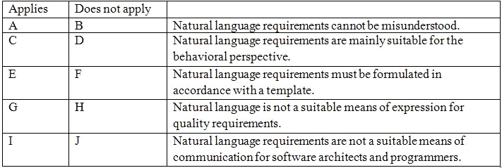 Assess the following statements about the natural language documentation of requirements in terms of being applicable or not applicable. (2 Points)